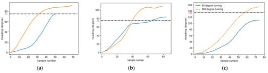 Examples of heading change while performing 90-degree and 180-degree turning. (a) Ninety-degree turning examples in , (b) 90-degree turning examples in , and (c) 90-degree and 180-degree turning in a 75-element window.