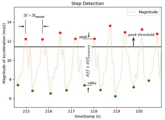- Three thresholds: In the peak detection method, there are three types of thresholds, as shown in Figure 13. The red points are peaks and the green points are valleys. The orange dashed curve is the magnitude of accelerometer readings. The first threshold is the peak threshold (shown by the horizontal line in Figure 13). A peak is detected if its value is above this threshold. The second threshold is the difference between the combined magnitude of acceleration peak and its adjacent valley, . When that difference is more than the threshold, a step is counted [66]. The third threshold is the time interval between two sequential steps, (shown by red points) according to the studies [67,68], when a pedestrians’ step frequency is less than 5 Hz (0.2 s per step). A step is counted only if the time interval is more than this threshold.