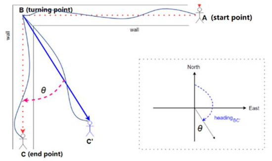 The inertial sensor orientation or rotation consists of roll, pitch, and yaw in an Euler angle representation, where roll and pitch are also called attitude, elevation, or declination, while yaw is called heading or azimuth angle in the horizontal plane [37]. The process of heading determination is to estimate the orientation. Some methods utilizing gyroscopes or a combination of gyroscopes and accelerometers have been proposed [37,38], but their performance is less robust than the methods using MARG (magnetic, angular rotation rate, and gravity) sensors that consist of gyroscope, accelerometer, and magnetometer sensors. Methods using MARG sensors can estimate the complete orientation relative to the direction of gravity and the earth’s magnetic field to reduce the gyroscope’s integration error [38]. Kalman filters [39], complementary filters [40], and gradient descent [38] are the major methods used in implementing the orientation estimation based on MARG sensors. After the orientation is calculated, the heading is then found. Though these methods could achieve accurate performance within a short time, the heading drifts away from the heading ground truth over time because of sensor drift. In addition, the heading of the smartphone is sensitive to the movement of the smartphone such as vibration, swinging, and turning. Hence, these factors will drive the trajectory estimated by PDR away from the ground truth. It is necessary to investigate heading correction methods to optimize PDR trajectories.