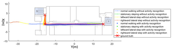 Firstly, we qualitatively analyze the effects of lateral walking and stationary stepping on positioning performance. As shown in Figure 16, on the 8th floor (the size of the experimental area is about 41 × 37 × 9 m3), the experimenter stands stationary for a while at point A, then performs normal walking until point B, then starts rightward lateral walking to point C, and finally performs leftward lateral walking to point B. This process is displayed as a crossed red line (the ground truth), and different activities are in different colors. Comparing the thin and dotted line, it is noticeable that the positioning accuracy can degrade sharply when the recognition of lateral walking and stationary stepping is not used. Thus, the effects of these two activities on the positioning are very significant.