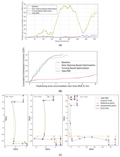 To quantitatively analyze the performance of above four types of processing strategies, the PEA-T measured at the reference points is displayed in Figure 18a. The X-axis is the elapsed time in unite of second that the experimenter moves along the route. The Y-axis is the value of PEA-T. The marks in these PEA-T lines represent the positioning errors of each reference point. The start point of four PEA-T lines are the same, 0. Then the PEA-T of the baseline becomes higher than the other three strategies. From Table 9, the baseline’s mean PEA-T is 37.73 m with a standard deviation (STD) of 29.46 m. The PEA-T of door-opening-based optimization is slightly lower than the baseline. Its mean and STD PEA-T are 36.82 and 28.95 m, respectively, which proves that the door-opening-based optimization can slightly improve the positioning performance. The PEA-T of the turning-based optimization is noticeably lower than those of the baseline and door-opening-based optimization, of which the mean and STD are 1.92 and 1.49 m. respectively. In addition, the PEA-T of HAA-PDR system is the smallest, which means it has best performance in this experiment, with a mean of 1.79 m and STD of 1.13 m. Finally, the error at the end of the trajectory of the HAA-PDR system is 2.68 m, which is far more accurate than all other methods.