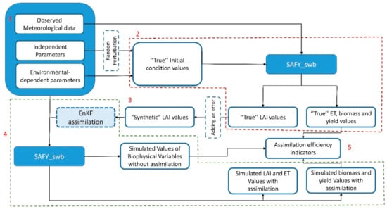 Scheme for the analysis of the assimilation efficiency of the EnKF-SAFY_swb method. (1) Phase 1: Input setting. (2) Phase 2: “True” values evaluation. (3) Phase 3: “Synthetic” LAI values elaboration. (4) Phase 4: Model running. (5) Phase 5: Calculation of AE indicators.