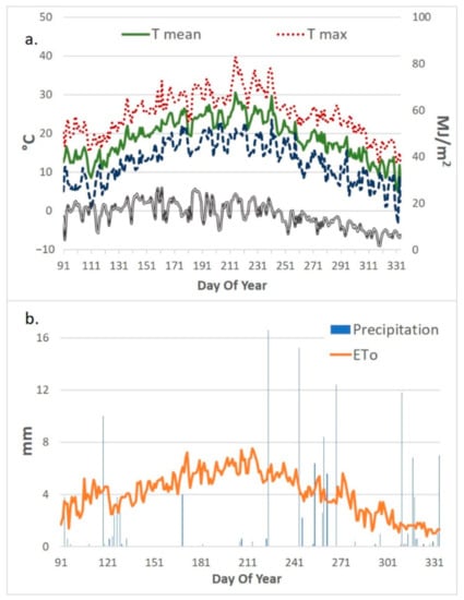 Climatic data for Grosseto2018. (a) temperature and daily solar radiation; (b) precipitation and reference evapotranspiration. Data provided by Consorzio Lamma, Laboratory for Meteorology and Environmental Modelling.