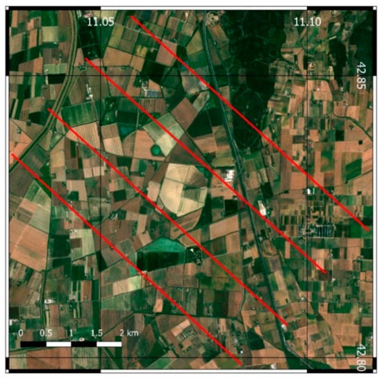 The airborne data used in this study were gathered as part of the Surfsense2018 ESA campaign and used to evaluate the ET []. The sensor used was the Thermal Airborne Spectrographic Imager (TASI-600), a push broom hyperspectral thermal sensor system specifically designed for airborne data acquisition. It is sensitive to wavelengths in the long wave infrared (LWIR) and measures the intensity of emitted radiance from the imaged target across 32 spectral bands in the range of 8 to 11.5 µm. The data were acquired on the 199th and 201st day of the year (18 and 20 July), between 12:00 p.m. and 4:00 p.m. (local time), following the flight plan shown in Figure 4. The data acquired with the TASI were used to estimate the Surface Temperature ().