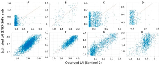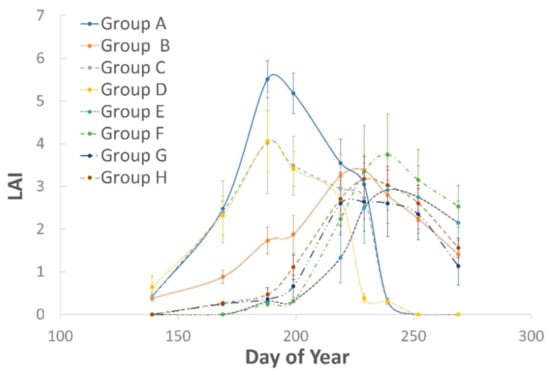 The trend of average LAI for each group of fields (defined as described in Section 2.3.1) and the corresponding standard deviation were calculated and are shown in Figure 5. For each trend, the images were used for the assimilation, except the last image of the trend, which was used to validate the simulations generated with the EnKF-SAFY_swb.