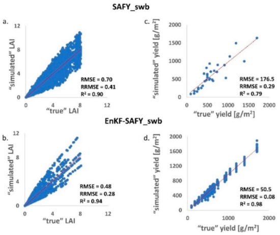 In order to evaluate the assimilation efficiency of EnKF-SAFY_swb, a procedure based on synthetic data, proposed by [], was applied. This allowed for rigorously quantifying the advantage of LAI assimilation in SAFY_swb using the EnKF method, compared to the simple use (called open loop) of the model.