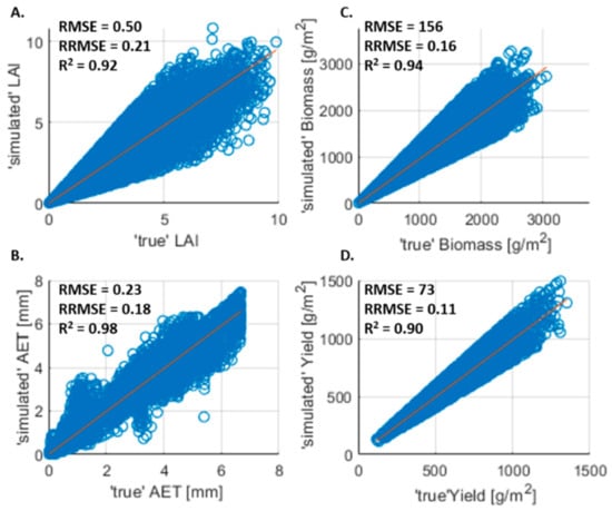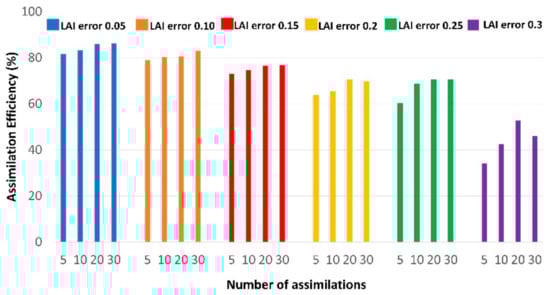 In this case, the number of assimilated observations was also varied. A set of 5, 10, 15 and 20 observations (and corresponding assimilations) were considered. In this way, 600 simulations were finally carried out. For the general case, the yield was used as a reference variable to calculate ,  and, consequently, the assimilation efficiency index  (Equations (2)–(4)).