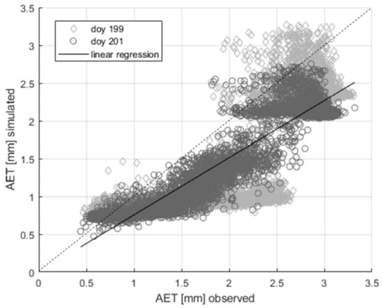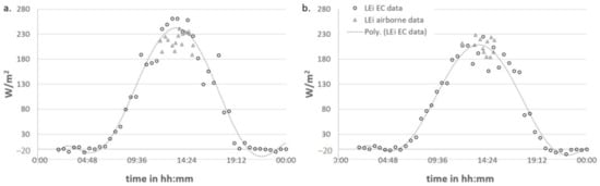 We extrapolated from the images acquired via airborne the points corresponding to the geographical position of the EC footprint. We compared the daily trend of LEi in the days of acquisition via airborne in the interval of time in which the flight took place. This is a purely qualitative comparison because of the relatively small data set. This comparison (Figure 9) shows that there is correspondence between the data with an average error of 9% (between the airborne and the EC measurements). In this specific case, we are interested in analysing the ET, which, according to the method suggested by [] and described in Section 2.3.3, is calculated using a single measure of daily LEi. The comparison in Figure 9 therefore allowed to select the time in which the estimation of LEi derived from the airborne data is closer to the maximum of the polynomial regression function calculated from the LEi estimations measured by the EC sensor.