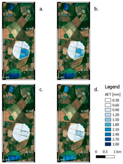 Stancalie et al. [], for example, proposed a method for the estimation of actual ET maps using data acquired by NOAA–AVHRR and validating the results with the value of ET estimated by models, noting the difficulty of obtaining real spatial data measured in situ. Another study presented by [] proposed the use of EO data acquired through Deimos-1 and Landsat-8 in synergy with a Penman–Monteith equation [] based model, obtaining encouraging results. The validation was carried out based on 18 sites for an analysis at regional scale. The study concludes by encouraging the use of similar methodologies also for higher spatial resolution, using modern sensors such as those aboard Sentinel-2.