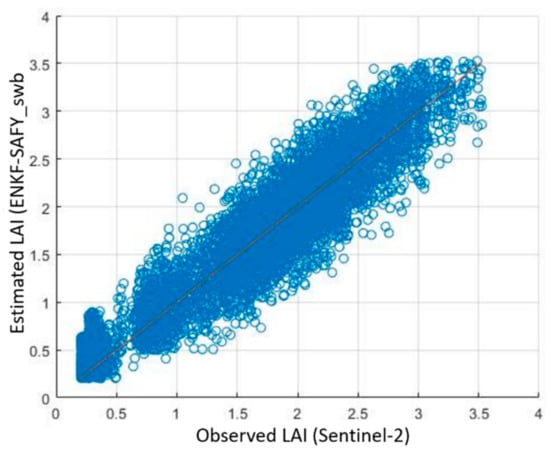The method proposed in this study, which uses the LAI retrieved from Sentinel-2 data with a modified version of SAFY that considers the soil water balance as an input, through a DA method based on the EnKF, sought to address some of the most common problems found in the literature. We studied the problem both from a spatial and temporal point of view. It is part of the scientific field of DA methods for a synergistic use of EO data with crop growth model that uses a filtering approach, according to the classification proposed by [].