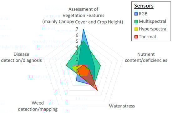The RGB and multispectral sensors were particularly effective for assessing canopy cover, crop height, growth rate, determinacy, senescence, and maize tassel branch number, among other plant traits. The studies with multispectral sensors also revealed the best vegetation indices for assessing stresses caused by nutrients and water (e.g., NDVI) or by biological agents such as weeds and diseases (e.g., NDRE, CIgreen). The hyperspectral sensors were focused on disease detection, given the ability of these sensors to observe spectral differences at certain wavelengths that are sensitive to biochemical and biophysical changes caused by plant disease. Finally, the research applied the thermal sensors mainly for water stress measures, aiming to develop efficient irrigation systems by optimizing water use at the crop field scale.