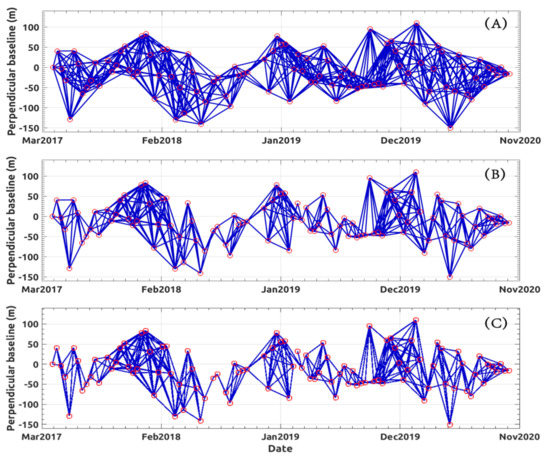 We applied the developed ISA method to the available SAR images to identify an optimized group of SB multi-look interferograms that the conventional SBAS technique has subsequently processed. To this aim, we preliminarily identified a group of “candidate” SB SAR data pairs characterized by the maximum temporal baseline days, and we did not apply any constraint on the maximum perpendicular baseline of the interferograms. Figure 3A shows the distribution of preselected SB interferometric SAR data pairs in the temporal/perpendicular baseline plane. In this domain, the available SAR images are represented by red circles. The arcs connecting pairs of SAR data (drawn in blue) identify the set of candidate SB SAR data pairs. Once identified, a group of 656 SB multi-look interferograms was generated.