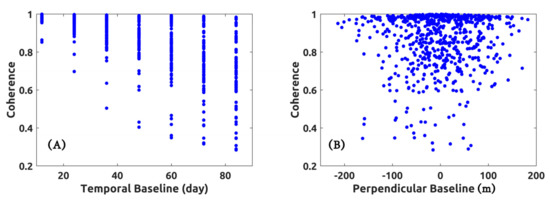 Scatter plot of average spatial coherence of candidate SB data pairs vs. their (A) temporal and (B) perpendicular baseline.