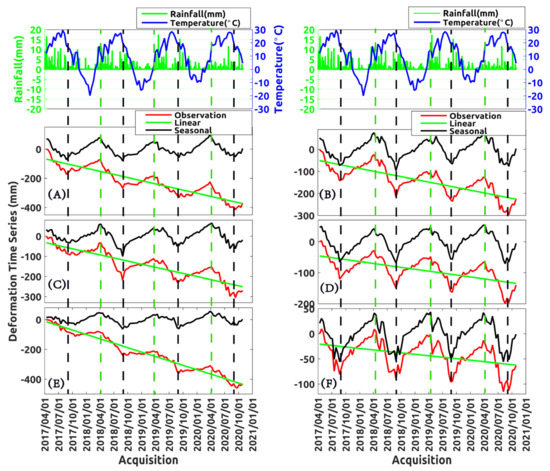 Deformation, temperature and rainfall time series comparison at six points, A–F (as described in Figure 8). The first line is a rainfall and temperature time series. (A–F) deformation including observation, linear and seasonal deformation time series, respectively. Vertical dotted black and green lines show the inflection points of seasonal term deformation.