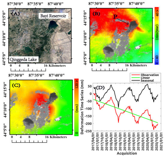 (A) Zoomed view of the optical image shown in Figure 8, corresponding to Bayi Reservoir and Qinggeda Lake. (B) Mean deformation velocity map. (C) Map of seasonal deformation amplitude values. (D) Plot of the ground deformation time series related to point P, highlighted by a black arrow in (B).