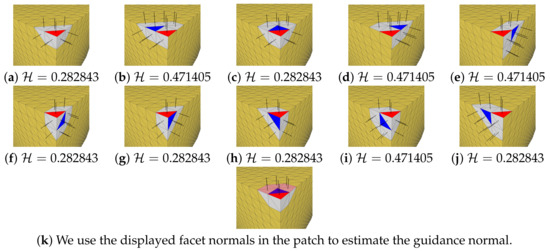 However, after selecting a patch according to the consistency measures , for a face of interest occupying the entire angular position, the GMNF method [5] cannot obtain a suitable patch, and its calculated guidance normal will lead to incorrect guidance. For a convenient explanation, we take the clean model in Figure 2 as an example, where red is the face of interest, blue is the center face of the corresponding patch, and the center face of the patch in Figure 2a is the current face of interest. Although the GMNF method [5] can choose the patch shown in Figure 2a,c,f–h or Figure 2i, this is possible because according to Equation (7) of GMNF [5], the consistency measures of these patches are the smallest and are equal. However, regardless of which of these patches is selected, the calculated guidance normal cannot be used as the correct guide. This is because according to Equation (11) of GMNF [5], the guidance normal is the average normal of all faces in the patch according to the area weighting. The weights of all normals in the patch are almost the same (including normals that have a larger angle with the face of interest), which will cause incorrect guidance and eventually lead to the loss of corner features, as shown in Figure 3c.