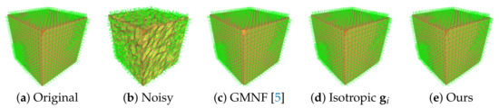 To address this problem, we propose using a dual weight function to calculate the guidance normal of the selected patch, as shown in Equation (5). For the situation in Figure 2, when the face of interest selects a patch that crosses the fluted line or the corner feature, the guidance normal calculated by Equation (5) can filter out the internal normals that have a large deviation from the face of interest. Through the filtering effect of the parameter , regardless of which patch with the most consistent internal normal is selected, we can obtain the correct guidance normal. For example, if the patch shown in Figure 2c is selected, we only need to use the isotropic normal shown in Figure 2k to calculate the guidance normal, which prevents the interest normal from being guided incorrectly. On the other hand, for areas that are flat or less variable, the normals inside the patch are more consistent and closer to the normal of interest, and the guidance normal calculated by Equation (5) is the same as that of Equation (11) of the GMNF method [5]. Therefore, the proposed dual weight function can adaptively obtain stronger and more accurate guidance normals.