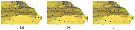 At this time, the eigenvectors and of the shape edge point voting matrix are consistent or close to the orientation of the support neighborhoods; then, we can use its feature vector to cluster the vertices of the support neighborhoods. They are clustered into two categories close to and , namely and . For the corner points, we can similarly cluster their supporting neighborhoods into three categories close to , , and , named , , and . The clustering results (green) after denoising the non-feature vertices are shown in Figure 7c. Since the positions of the non-feature points were updated, the noise in these areas was reduced. At this time, using them to fit the plane can yield a more accurate plane that fits the model surface. If the number of vertices of a certain cluster is less than 2, it is considered unreliable and does not constitute a support plane. Each support plane has a pulling force for the feature point of interest, and this pulling force is defined as .