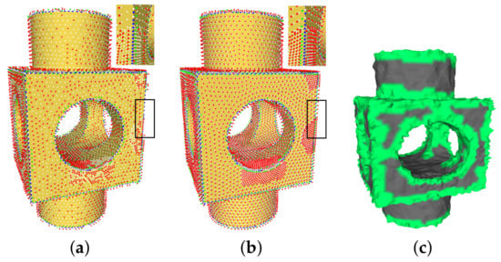 The directions of the three feature vectors , , and do not necessarily satisfy the right-hand rule, nor do they all point from the model surface to the outside of the model. As shown in Figure 7a, red represents , green represents , and blue represents . For non-feature points, does not necessarily point to the outside of the model, and it may be opposite to the normal of the vertex. For shape edge points, and may be in the opposite direction from the normals of the region elements adjacent to both sides of the edge (we call the feature point the “supporting neighborhood”). For feature corners, the directions of , , and may also be opposite to the normal directions of their supporting neighborhoods. We use the vertex normal to correct the directions of , , and . When the angle between the eigenvector and the normal of the point is greater than , it is reversed. The corrected result is shown in Figure 7b.
