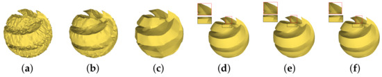 After updating the non-feature points, the centroid and normal of the face will be updated. is the current normal of face , and is the last filtered normal in the current iteration. The larger the difference between and is, the larger the scale of the feature, the smaller the value of , and the smaller the extent of filtering. In each iteration, more large-scale features are retained or restored. Figure 8 shows the comparison results of updating the feature points with different normals. Figure 8a shows the noisy SharpSphere model; Figure 8b shows the result of using the current normal to directly update the feature points without filtering the normals again, which makes it difficult to restore the geometric features of the model; Figure 8c shows the result of using the guidance normals to update the feature points without filtering the normals again, which means the guidance normal will introduce pseudofeatures; Figure 8d shows the result of directly updating the feature points with the last filtered facet normals in Equation (7), where the edges may be incorrectly connected and some geometric shapes will be lost; Figure 8e update feature points using a approximate faltered normal in Equation (14), where is replaced by the guidance normal and then updating the feature points, which loses some of the feature corners; and Figure 8f shows our result, obtained by using the filtered facet normal in Equation (14) to update the feature vertices. Our results retain or restore more geometric features.