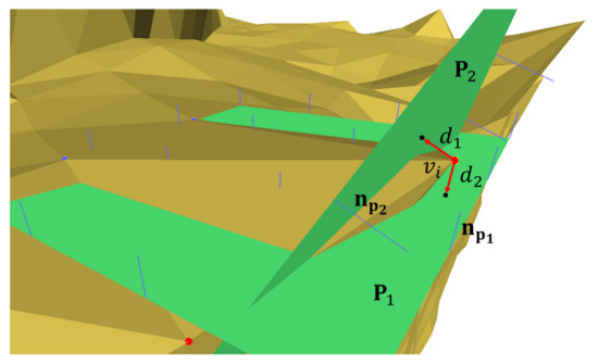 We update the positions of the shape edge points according to both the neighbor facet filtered normal and its support neighbor fields. The positions of the feature points are first affected by the tensile force of the neighboring filtered facet normals, and the correction amount for this part is expressed by Equation (16). Second, the feature points are also affected by the support neighborhoods, and these two sides of the edge line correspond to the local support plane. The distance from these planes produces a second part of the tensile force . The correction amount for this part can be expressed by Equation (17), as shown in Figure 10. Similarly, there are three local support neighborhoods and three planes for the corner points, and the correction amount due to the distance from these three support planes is also expressed by Equation (17):
