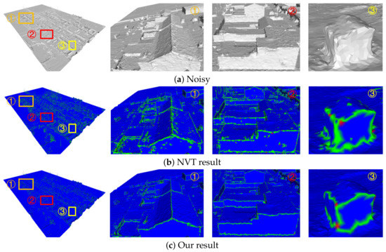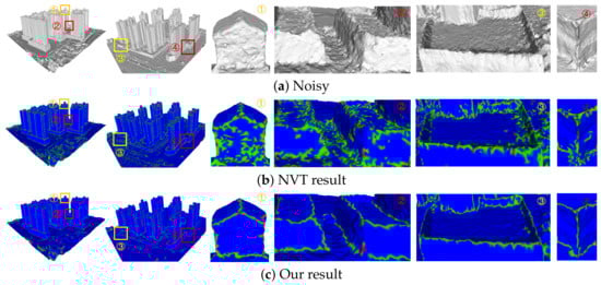 The limitations of the algorithm are presented as follows. Firstly, when a detail with characteristic size D is sampled on the object surface and the noise of the sample is D/2 or larger, the limitations of the algorithm are: (1) the result of feature classification is not real. According to the Nyquist–Shannon theorem [48], in this case, the geometric sampling will appear as an aliasing phenomenon, and the geometric structure of the surface will be distorted, so the features obtained by our algorithm is the substitute of the real features; (2) The denoising results will lose the scene structure. Since denoising is an ill-posed problem, our algorithm cannot accurately recover the real structures from the distorted noise model; Secondly, our denoising method cannot deal with small holes in noisy meshes well. Figure 20c illustrates such an extreme case, where the noise around the holes is not removed as expected. However, small holes do not affect the classification of feature points, as shown in Figure 20b. In addition, in Figure 16, the denoising result of the low-intensity noisy model is almost not affected by small holes.