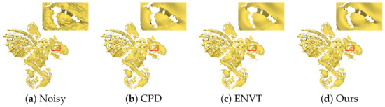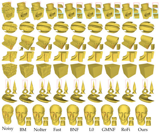 - Wei, M.; Huang, J.; Xie, X.; Liu, L.; Wang, J.; Qin, J. Mesh denoising guided by patch normal co-filtering via kernel low-rank recovery. IEEE Trans. Vis. Comput. Graph. 2018, 25, 2910–2926. [Google Scholar] [CrossRef]