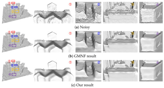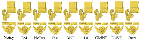 The qualitative and quantitative comparisons help in analyzing the capabilities of all comparison algorithms. It can be seen that the BM method [3] can denoise models with low noise intensity, such as scanning models, but it is not suitable for handling large noise, and the feature retention effect is not ideal. The smoothing effect of the NoIter method [27] is better, and it can handle low-intensity noise; the denoising ability decreases with the increase in noise intensity, it is suitable for processing scanning noise, and the feature retention effect is not ideal. The Fast method [28] is suitable for dealing with various types of noise, and the denoising ability is strong, which can retain features to a certain extent; the BNF algorithm [4] is suitable for processing various types of noise. It has a strong denoising ability and good feature retention performance; this basic algorithm is not ideal for non-uniform noise processing. The L0 algorithm [23] has a strong denoising ability and can yield a very smooth model. It retains large-scale structural features to a certain extent but may introduce false features to deal with non-uniform noise. The GMNF algorithm [5] has a strong denoising ability and can be retained to a certain extent or restore sharp features but often introduces false features, which may lose angular features, and it can handle non-uniformly sampled noise. The RoFi algorithm [32] has a strong denoising ability and can handle a variety of noise; fewer triangles are flipped, and the feature retaining ability is strong, but it may introduce false features. The CPD method [9] is unstable and easily causes flying spots on the surface of the model. Our algorithm can handle a variety of features, handle non-uniform noise, consider the structural features of the scene, and retain or restore features with strong reliability, and it does not easily introduce false features.