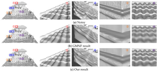For real noisy data, such as 3D reconstruction models based on oblique images and scan data, the current commonly used denoising methods often smooth details or sharp features because not all vertices are treated differently. The GMNF method also has the problem of introducing pseudofeatures. Our goal is to keep as much of the larger local features as possible in the local neighbors and avoid introducing pseudofeatures that are too sharp locally by controlling the strength of feature restoration.