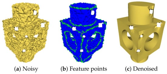 Feature points are an important representation of the geometric structure attributes of 3D models; they constitute the contour features of 3D models and highlight the boundary and geometric structure of 3D scenes, which are the key basis for retaining and restoring structural features in the process of 3D model mesh denoising. To better retain sharp features, researchers began to explore feature-based denoising methods [7,8,9], they first classify feature vertices and then apply different denoising strategies to update the vertex position. However, due to the noise sensitivity of surface normals, the detected features may suffer from information loss or confusion.