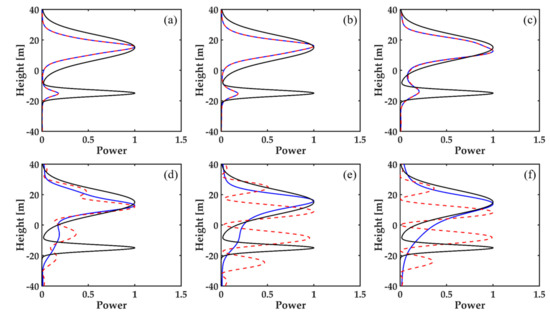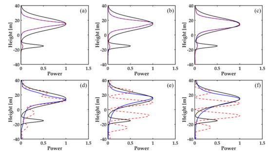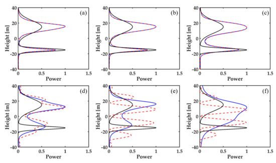 Reconstructed reflectivity profiles by the RIAA and IAA methods with different tomographic apertures in the third scattering scenario: (a) 30 m; (b) 25 m; (c) 20 m; (d) 15 m; (e) 10 m; (f) 5 m. The black solid lines are the true simulated reflectivity profiles. The blue solid lines are the reconstructed reflectivity profiles of RIAA. The red dotted lines are the reconstructed reflectivity profiles of IAA.