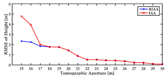 Moreover, for exploring the tomographic aperture at which the RIAA and IAA methods begin to diverge, the root-mean-square-errors (RMSEs) of scattering phase center height estimated by these two approaches were calculated with different tomographic apertures, as shown in Figure 5. It is clear that the two estimators start to diverge at the tomographic aperture of around 17m in this case. With the decrease in the tomographic aperture, RIAA shows a better performance than IAA. This suggests that RIAA is a more robust TomoSAR method in the case of a small tomographic aperture.