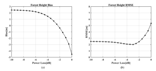 Error of the forest height versus power loss with respect to the phase center elevation: (a) bias; (b) RMSE.