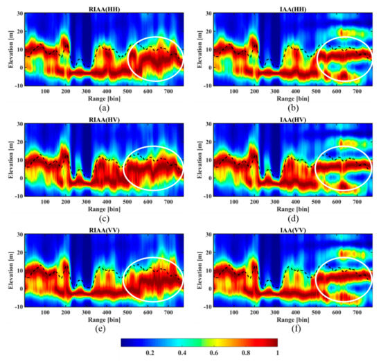 In order to further demonstrate the advantage of the RIAA TomoSAR method, IAA was also used to undertake tomographic focusing at the same range profile. The same parameters (estimation window, height range, and height sample interval) were used in the IAA method. Figure 10 shows the reconstructed tomograms in three polarizations from RIAA and IAA estimators, respectively.