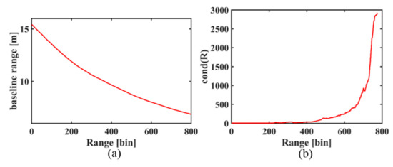 In addition, to analyze the different performances of IAA and RIAA between the near range and far range, the condition number of the covariance matrix was calculated at different range locations (see Figure 12). This indicates that the tomographic aperture decreases and the condition number of the covariance matrix increases from the near range to the far range, especially after the 500th range bin. This brings about the ill-posed problem for the inversion of the covariance matrix for the IAA estimator in the far-range part. However, by considering the noise contribution, RIAA can ensure that the condition number of the covariance matrix is not too large. Thus, in this case study, RIAA can always achieve a pleasing performance, from the near range to the far range, whereas IAA cannot achieve this.