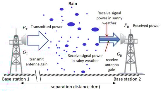 Schematic view of a wireless transmission link from one base station to another during rain and the received signal power is additionally attenuated by A (dB).