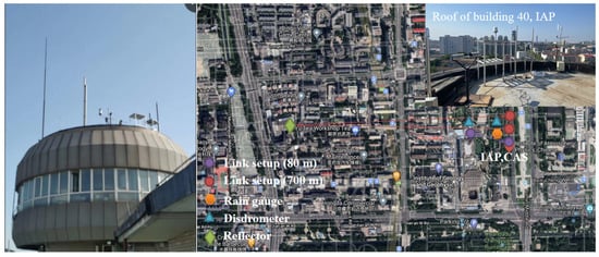 Atmospheric attenuation due to rain can become more severe at millimeter frequencies. To gain an understanding of the relationship between the rainfall rate and rain-induced attenuation at our measurement site, we built line-of-sight transmission links of 80 m and 700 m long, and the operating frequency of the link was at 25 GHz or 38 GHz. Our field measurement started in 2016 and took place at IAP, CAS in central Beijing [,], as shown in Figure 2. Occurring at the transmitting end, we generated stable signals using a signal generator with negligible temperature-induced variations. The signal was then put through a horn antenna which was vertically polarized. Occurring at the receiver side, an identical horn antenna was connected to a signal analyzer for signal reception and display. The instantaneous received signal power was recorded. The measurement link setup and parameters are given in Table 1.