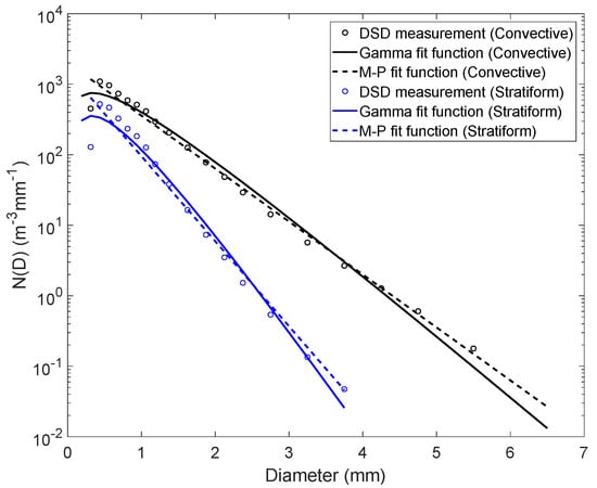 where N(D) represents the rain DSD, N0 is a constant in m−3, (mm−1) is the slope parameter, and D (mm) is the equivalent volume diameter. Atlas and Ulbrich [] suggested fitting a gamma function to the rain DSD, and the gamma distribution is widely used for representing natural DSD variability [] in the form: