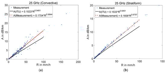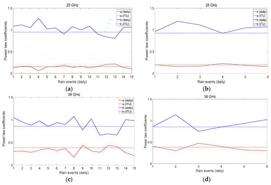 Additionally, the a and b values also were derived on a daily basis when rainfall occurred for the convective and stratiform events, respectively. Figure 5 presents the a and b values for 16 stratiform rainfall events and six convective rainfall events compared to the values from the ITU-R P. 838 for 25 GHz and 38 GHz. Considering Figure 4 and Figure 5, the derived a and b values based on measurement at IAP in Beijing are close to the values given in the ITU. While the rainfall rate increases, when the rainfall rate is greater than 10 mm/h, the rain-induced attenuation estimated by the ITU model is noticeably lower than the attenuation estimated by the local rain DSD information.