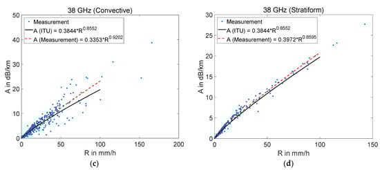 The relation between the rainfall rate R and attenuation A for (a) a 25 GHz link in convective precipitation (b) a 25 GHz link in stratiform precipitation (c) a 38 GHz link in convective precipitation (d) a 38 GHz link in stratiform precipitation.