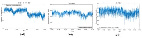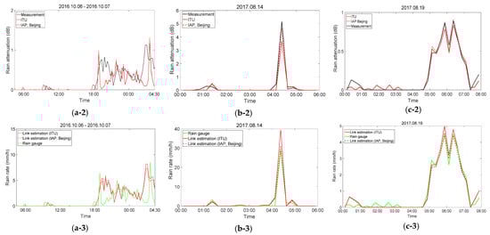 (a-1,b-1,c-1) Link instantaneous signal level on 6–7 October 2016, 14 August 2017, and 19 August 2017; (a-2,b-2,c-2) The measured average rain attenuation per 15 min, the rain attenuation based on the ITU model and rain attenuation calculated using locally derived coefficients on 6–7 October 2016, 14 August 2017, and 19 August 2017; (a-3,b-3,c-3) The link retrieved rainfall rate based on coefficients (a, b) from the ITU model and the derived (a, b) from local measurements, compared to the rain gauge measurement on 6–7 October 2016, 14 August 2017 and 19 August 2017. (Note the signal measurement is discussed in [] but based on (a, b) coefficients in ITU-R P.838 document, the analysis in this paper shows the derived coefficients achieved an improved rainfall rate estimation).