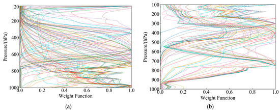 The HIRAS infrared hyperspectral sounder has 2275 spectral channels. Using all channels for retrieval cannot improve the retrieval accuracy. On the contrary, too many channels will increase the retrieval error [22]. This is because some channels have similar feature information, there is a large correlation between channels, and some channels will be affected by multiple atmospheric parameters. Therefore, it is particularly important to select a suitable channel for atmospheric parameter retrieval. The channel used for retrieval in this study was selected based on the information entropy capacity analysis and the peak of the weight function; that is, we selected the channel containing more atmospheric parameter information (temperature and humidity), and combined the peak position, peak size, and curve steepness of the channel weight function.