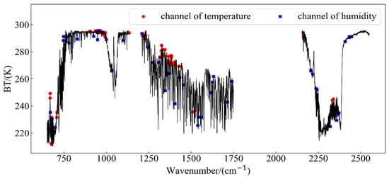 The weight function curve is the first derivative of the transmittance with the vertical height. The peak value of the weight function indicates the strongest absorption position on the radiation transmission path; that is, the peak position is the position at which the specific pressure level can be detected by the corresponding spectral channel [22]. This study introduces the peak height of the weight function as the channel selection criterion. As shown in Figure 2, the Jacobian matrix was normalized according to the maximum value to obtain the normalized weight function. It can be seen that the peak value of the weight function of temperature and humidity almost covers most of the pressure levels, which could be because the channels we selected were combinations after optimization. The position of the selected channel of temperature and humidity in the spectrogram is shown in the Figure 3: