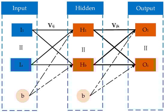 In Figure 4, I is the neural network input data (Input), H is the output data of the neural network training hidden layer (Hidden), O is the output data of the neural network training output layer (Output). In this experiment, a hidden layer was set. The neurons in the adjacent layers were connected by weight V, intercept b, and an activation function. The activation function of the hidden layer is the sigmoid function [13]: