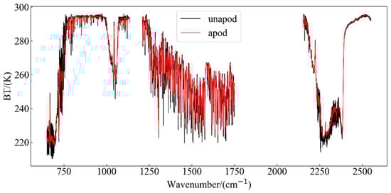 As mentioned above, HIRAS L1 level data have not undergone apodization. In actual business applications, in order to reduce the side lobe effect, it is necessary to perform apodization calculations on spectral radiation data. Referring to HIRAS L1 level business data [46], we selected the Hamming function as a function of apodization in this experiment. We apodized all the observed sample data, and a comparison of the spectral brightness temperature before and after processing is shown in the Figure 7: