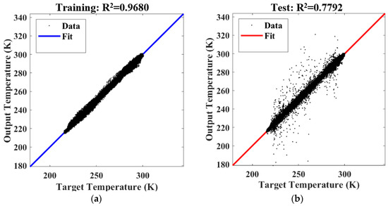 Result of training, Fit represents fitting results. (a) Correlation coefficient of the training data; (b) correlation coefficient of the test data.