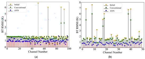 We calculated the RMSE between the simulated brightness temperature and the observed brightness temperature. As shown in Figure 9 of the cotton swab, the yellow dots represent the uncorrected initial observation error distribution (Initial), the blue dots are the observation error distribution after the neural network correction (ANN), and the green dots represent the results of conventional deviation correction (Conventional). The RMSE of the brightness temperature of the temperature channel corrected by the neural network is less than about 2 K as a whole, and the RMSE of the brightness temperature of the humidity channel is less than 1.5 K as a whole. Compared with the conventional deviation correction method, neural network observation error correction has a certain extent of accuracy improvement in both temperature and humidity channels. The maximum RMSE of the brightness temperature difference between the two methods reached 3.5 K in the temperature channels, and the maximum RMSE of the difference was 5.5 K in the humidity channels. Figure 9 clearly shows that the neural network algorithm correction effect was stronger. Therefore, using a neural network method to correct the observation data of the selected channel can more effectively reduce the error between the observation data and the forward model simulation values.