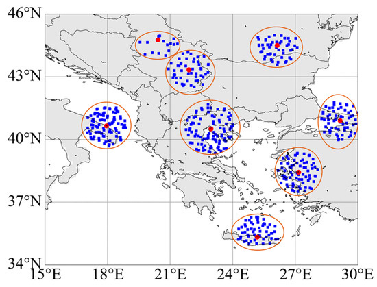 The red dots are the sounding sites. We looked for HIRAS observation data points that satisfy Formula (21) and that have been preprocessed by the retrieval system around the sounding station. A sounding station should be matched by at least 4 observation sample points [13] and cannot be concentrated on one side. We selected 497 groups of HIRAS observation sample points (blue dots in the figure). Among these groups, we matched the time, longitude, and latitude of the GFS forecast data with the selected HIRAS observation samples through linear interpolation, and we finally obtained 497 sets of GFS profile data.