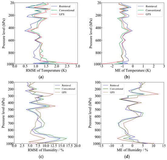Comparison between the retrieval profile and GFS and retrieval profile by the conventional method. (a) RMSE of temperature; (b) ME of temperature; (c) RMSE of humidity; (d) ME of humidity.