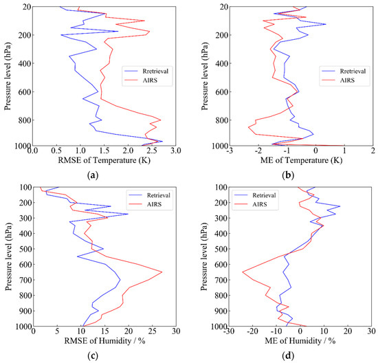 Comparison of the retrieval profile with the AIRS product. (a) Temperature RMSE, (b) temperature ME, (c) humidity RMSE, and (d) humidity ME.